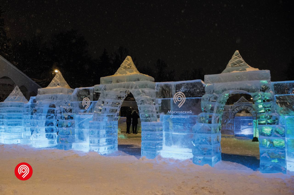 Настоящую зимнюю сказку этой зимой можно увидеть на Северном речном вокзале, где появился впечатляющий ледяной городок, стилизованный под древнерусскую крепость. Для его создания использовали более тридцати тонн натурального льда, доставленного из Мурманской области, а над архитектурой и декоративными элементами работали десятки профессиональных скульпторов. В результате на набережной вырос целый ледяной ансамбль с башнями, расписными горками и атмосферными инсталляциями, которые сразу погружают в настроение зимы.