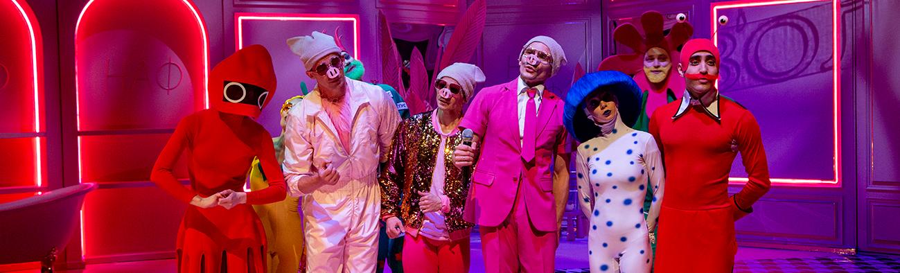 Спектакль динамичный и веселый, с декорациями в стиле арт-объектов в розовом цвете, с модными костюмами.