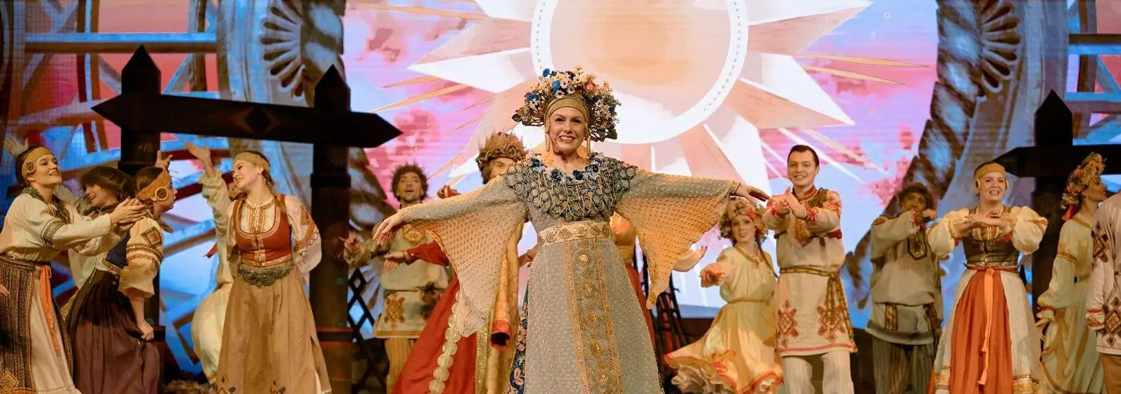 Спектакль наполнен обрядами и танцами, красивыми костюмами и красочными декорациями.