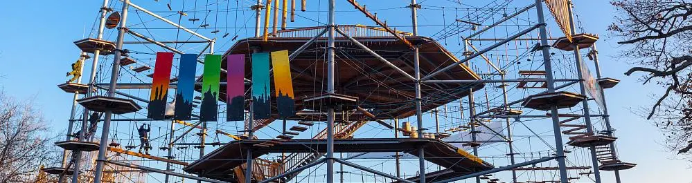 Всю территорию парка развлечений занимает единая конструкция, оборудованная для лазания и покорения высот Skytown обладает множеством трасс с разными уровнями сложности, именно поэтому он является практически универсальным для любых категорий посетителей.